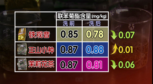 這次實驗以聯苯菊酯為例進行對比檢測,檢測結果顯示鐵觀音聯苯菊酯的含量為0.85毫克每千克、正山小種含量為0.87毫克每千克、茉莉花茶含量為0.87毫克每千克。這樣的結果是否符合國家的標準呢?趙建莊表示,食品安全國家標準里,茶葉涉及到的農藥聯苯菊酯最高殘留限量是5毫克每千克,記者購買來的樣品中的農藥殘留不到食品安全國家標準的五分之一。