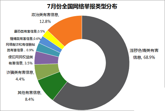 綜合分析全國舉報情況,淫穢色情類有害信息舉報仍較為突出,達107.5萬條,占比68.9%;政治類有害信息舉報占比12.8%;詐騙類有害信息舉報占比4.4%;侵犯網民權益類有害信息舉報占比3.5%;網絡敲詐和有償刪帖類有害信息舉報占比0.9%;賭博類、暴恐類等其他有害信息舉報占比9.5%。其中,不雅視頻、網絡暴力、歪曲歷史的有害信息數量較為突出,受到網民集中舉報和譴責。