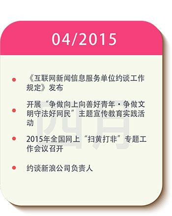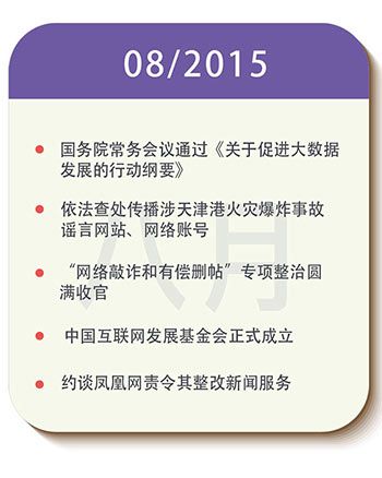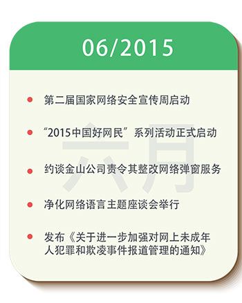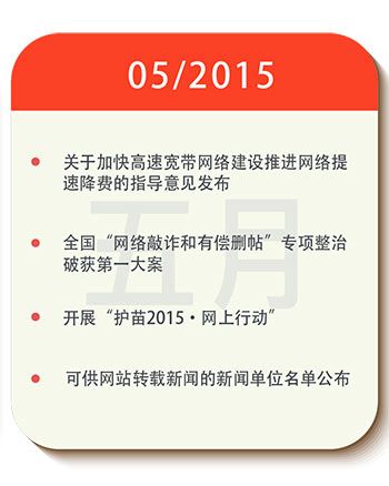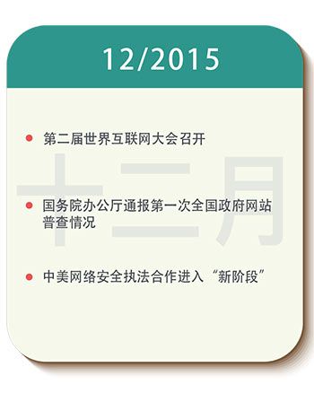 2015年是我國從網絡大國向網絡強國奮勇邁進的一年,是我國互聯網和信息化快速發展結出碩果的一年,是我國積極參與國際網絡空間治理的一年。在中國領導人的治網之道、治網理念的正確指導下,網信系統及相關部門繼續發揚“蠻拼”精神,出臺了一系列政策法規、推出網絡空間治理組合拳、搭建中國與世界網絡空間合作交流平臺。翻開2015年的網信工作日歷,以微見著,可以看到2015年我國的網絡生態進一步好轉,主旋律更加響亮,正能量更加充沛,網絡空間日漸清朗。