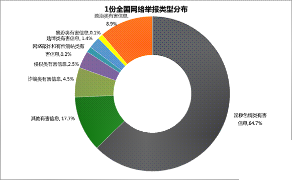1月份,中國互聯(lián)網(wǎng)違法和不良信息舉報(bào)中心直接受理、處置網(wǎng)民有效舉報(bào)38949件,較去年同期增長25.9%。經(jīng)核查,會(huì)同相關(guān)執(zhí)法部門處置“時(shí)尚圖片大全”“新葡京娛樂場(chǎng)”“北京宜信教育機(jī)構(gòu)網(wǎng)”等色情、賭博、詐騙網(wǎng)站81個(gè),有害鏈接18602條;通知新浪、騰訊、網(wǎng)易、百度依法處置傳播虛假信息的“博聞軒”“國民大參考”等博客賬號(hào)643個(gè)、微博賬號(hào)471個(gè);通知騰訊依法處置傳播色情低俗信息、售賣槍支彈藥等違法活動(dòng)的即時(shí)通信賬號(hào)“玫瑰與愛”“ss殺手接單”等972個(gè);通知百度、騰訊、好搜網(wǎng)、360云盤等網(wǎng)站、搜索引擎服務(wù)商、在線存儲(chǔ)工具服務(wù)商刪除色情低俗有害信息9203條;通知鳳凰網(wǎng)、百度貼吧、人人網(wǎng)、愛卡汽車網(wǎng)等網(wǎng)站刪除虛假信息5630條,刪除暴恐有害信息623條;通知新浪微博刪除鼓吹“臺(tái)獨(dú)”、宣揚(yáng)民族分裂的有害信息2102條;通知騰訊微信刪除捏造股市、房市虛假信息、擾亂金融市場(chǎng)秩序的有害信息622條。