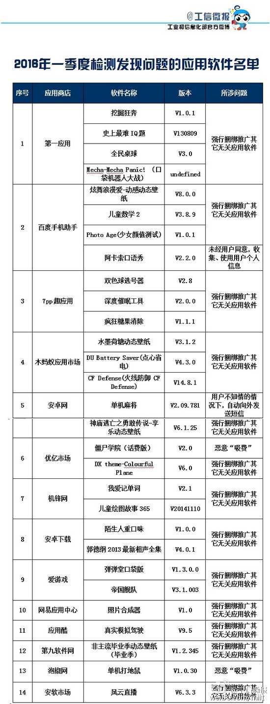 工信部5月27日公布的電信服務質量通告顯示,今年一季度工信部組織對43家手機應用商店的應用軟件進行技術檢測,發現不良軟件29款,涉及違規收集使用用戶個人信息、惡意“吸費”、強行捆綁推廣其他無關應用軟件等問題。