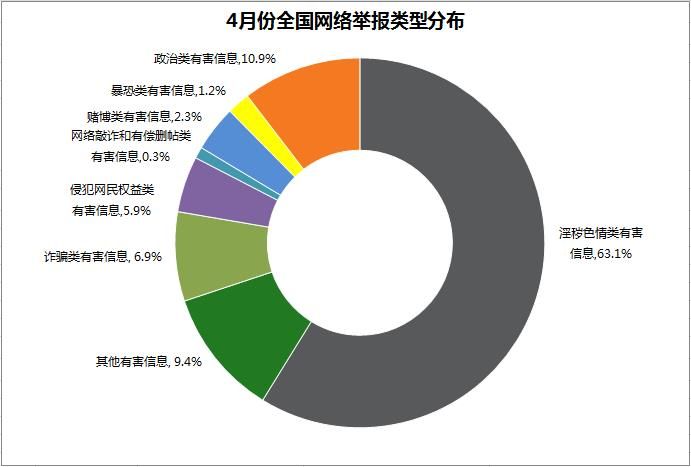 4月份,中國互聯(lián)網(wǎng)違法和不良信息舉報中心直接受理、處置網(wǎng)民有效舉報40632件,較上月增長16.2%。經(jīng)核查,會同相關執(zhí)法部門處置色情、詐騙、賭博網(wǎng)站及鏈接19921條;通知百度貼吧、新浪微博、騰訊、115網(wǎng)盤等網(wǎng)站、搜索引擎服務商、在線存儲工具服務商刪除色情低俗有害信息98096條;通知中國日報網(wǎng)、果殼網(wǎng)、中華網(wǎng)等網(wǎng)站刪除含有血腥殘忍內(nèi)容、販賣毒藥、教授炸藥制作方法的暴恐有害信息1620條;通知新浪、騰訊、網(wǎng)易、百度依法處置傳播虛假信息的博客賬號62個、微博賬號58個;通知騰訊依法處置煽動民族仇恨,從事販賣假幣、毒藥、槍支等違法活動的即時通信賬號923個;通知鐵血網(wǎng)、人人網(wǎng)、愛卡汽車網(wǎng)等網(wǎng)站刪除歪曲黨史國史、鼓吹房價上漲、唱衰我經(jīng)濟發(fā)展前景等刻意制造恐慌、煽動不滿情緒的虛假信息9875條。