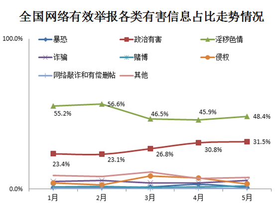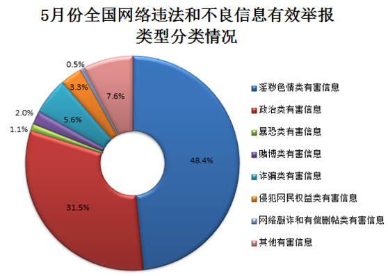 在全國(guó)網(wǎng)絡(luò)違法和不良信息有效舉報(bào)中,淫穢色情類有害信息舉報(bào)較為集中,達(dá)140萬件,占48.4%;政治類有害信息舉報(bào)占31.5%,占比連續(xù)三個(gè)月增長(zhǎng)。