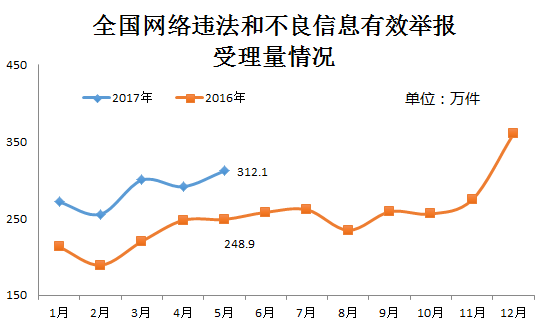 截至5月底,全國(guó)網(wǎng)絡(luò)舉報(bào)部門直接處置或向執(zhí)法部門轉(zhuǎn)交網(wǎng)民有效舉報(bào)約301.2萬件,通過各類渠道向網(wǎng)民反饋處置結(jié)果296.2萬件。其中,中國(guó)互聯(lián)網(wǎng)違法和不良信息舉報(bào)中心直接受理有效舉報(bào)70255 件,環(huán)比增長(zhǎng)約23.4%,同比增長(zhǎng)一倍多;各地網(wǎng)信辦舉報(bào)部門受理有效舉報(bào)約87.3萬件,環(huán)比增長(zhǎng)10.9%,同比增長(zhǎng)9倍多;全國(guó)主要網(wǎng)站受理有效舉報(bào)約217.8萬件,環(huán)比增長(zhǎng)5.2%,同比下降約8.1%。