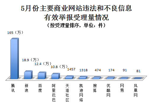 騰訊、新浪、百度、阿里巴巴等主要商業(yè)網(wǎng)站受理違法和不良信息有效舉報(bào)207.4萬件,處置或向執(zhí)法部門轉(zhuǎn)交199.4萬件。其中,騰訊受理有效舉報(bào)約165萬件(微信84.6萬件、QQ74.1萬件、網(wǎng)站舉報(bào)專區(qū)3.9萬件、騰訊網(wǎng)1.7萬件、騰訊微博6104件),新浪受理有效舉報(bào)18.9萬件(新浪微博15.7萬件、新浪網(wǎng)3.2萬件),百度受理有效舉報(bào)12.4萬件,阿里巴巴受理有效舉報(bào)10.8萬件,天涯社區(qū)受理有效舉報(bào)1457件,凱迪網(wǎng)絡(luò)受理有效舉報(bào)1318件,搜狐網(wǎng)受理有效舉報(bào)474件,優(yōu)酷網(wǎng)受理有效舉報(bào)174件,網(wǎng)易網(wǎng)受理有效舉報(bào)91件,鳳凰網(wǎng)受理有效舉報(bào)81件。