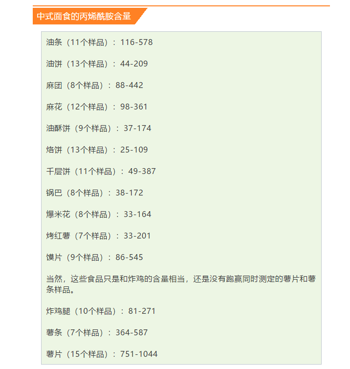 按照世界衛生組織(WHO)的食物污染物工作報告(WHO technique report series 959)中確認的丙烯酰胺攝入量界限值是180微克/公斤體重。按這個數值,一個體重50kg的女性,每天的安全攝入量是9000微克丙烯酰胺。
