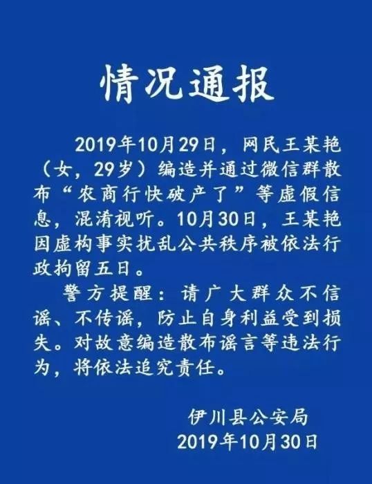 10月29日,河南一女子編造散布“河南洛陽伊川縣農商銀行各營業網點多名儲戶爭相前往取錢”謠言,并稱“農商行要倒閉”。