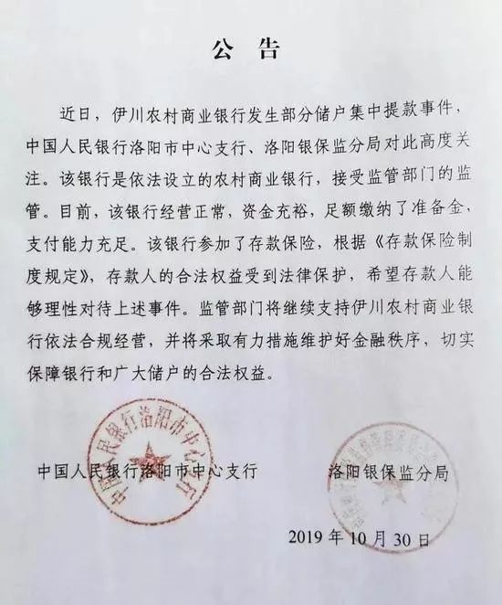 30日,中國人民銀行洛陽市中心支行及洛陽銀保監分局發布公告進一步回應。公告表示,目前伊川農商行經營正常、資金充裕,足額繳納了準備金,支付能力充足,且該行參加了存款保險,存款人的合法權益受到法律保護。