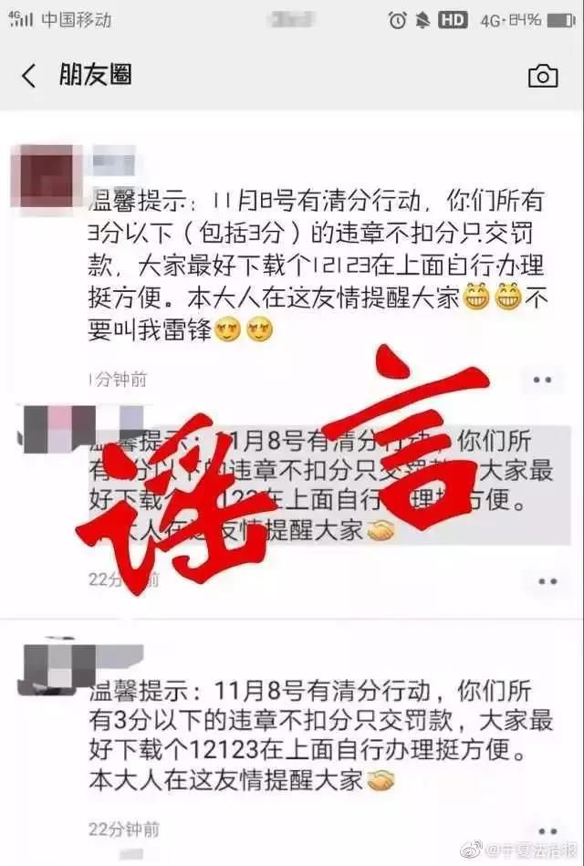 近日,寧夏本地多個(gè)微信群和朋友圈熱傳一條消息稱,“溫馨提示:11月8號(hào)有清分行動(dòng),所有3分以下違章不扣分只交罰款。大家最好下載一個(gè)12123在上面自行辦理挺方便。本人在這里友情提醒大家,不要叫我雷鋒。”