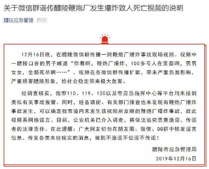 12月16日晚,在醴陵微信群傳播一則鞭炮廠爆炸事故現(xiàn)場(chǎng)視頻。視頻中一醴陵口音的男子喊道“你看啊,鞭炮廠爆炸,100多號(hào)人在里面啊,男男女女,全部死盡啊……”。視頻在各微信群傳播擴(kuò)散,帶來(lái)嚴(yán)重負(fù)面影響,嚴(yán)重?fù)p害醴陵形象,給社會(huì)穩(wěn)定帶來(lái)極大危害。