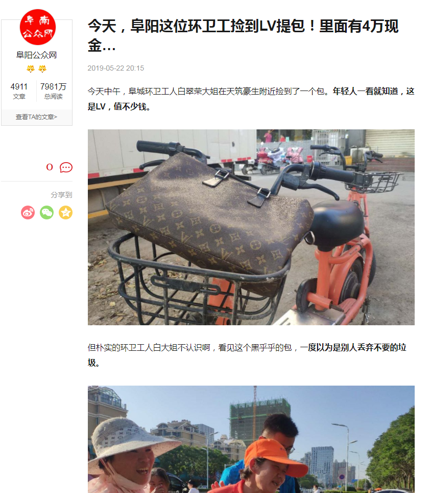 解放日報·上觀新聞記者查證發現:“環衛女工撿到裝有四捆百元大鈔名牌包”確有其事,它發生在今年5月的安徽阜陽;但是,該事件中并不存在“遭索賠萬元”等令人大跌眼鏡的故事情節。網傳故事是假的,它將一個拾金不昧的故事結尾改成了好心人遭索賠。