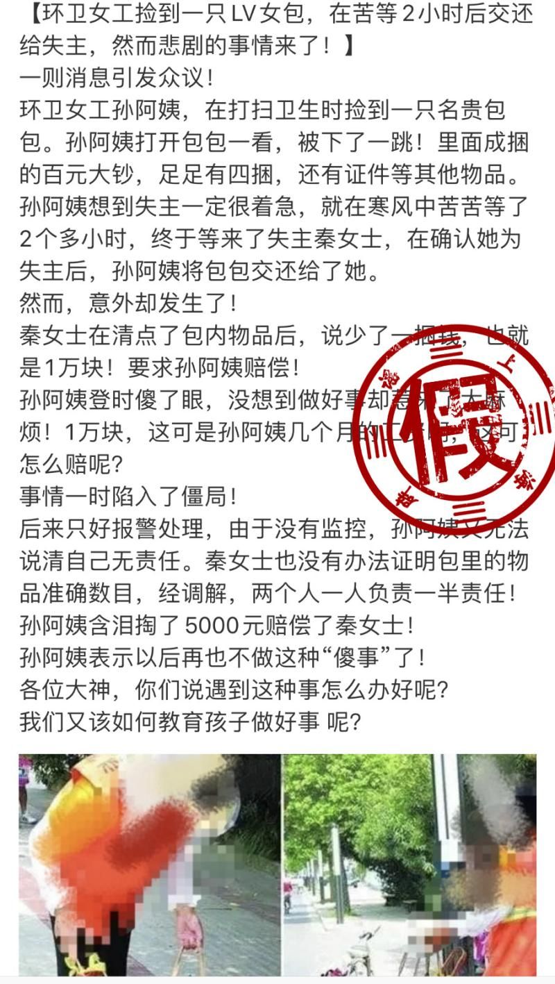 這兩天,一條題為《環衛女工撿到一只LV女包,在苦等2小時后交還給失主,然而悲劇的事情來了!》的帖子在網上熱傳。帖子講述了一個故事:環衛女工孫阿姨撿到一只LV女包,內有四捆百元大鈔和證件等物品,孫阿姨在寒風中苦等2個多小時終于等來了失主。不料失主卻稱,百元大鈔本應為5捆,包里現在少了一捆整整一萬元。報警調解后,雙方各負一半責任,孫阿姨含淚賠了5000元給失主。而這5000元,正是孫阿姨幾個月的工資。帖子中還附有一張環衛工人拎著女包的照片。