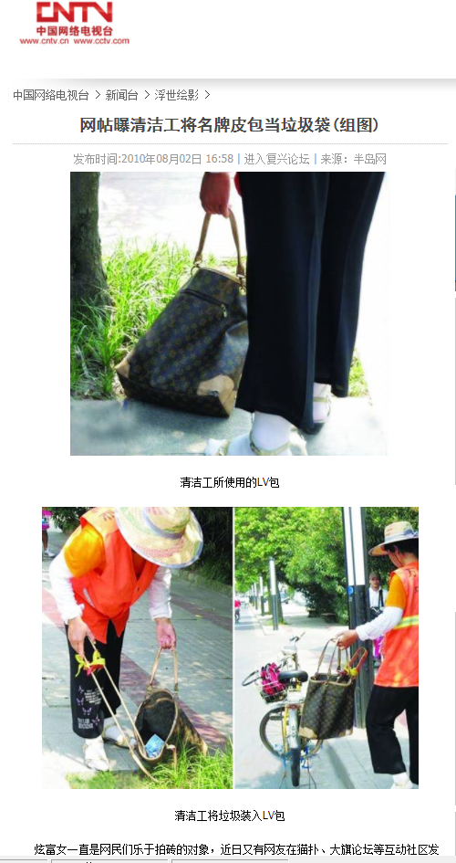 該報道中通篇沒有索賠的反轉情節。而且,網傳故事中所配的圖片也是從他處挪用拼接而來。記者通過圖片檢索發現,該圖最早出現在2010年某論壇的一個帖子中,有網友稱在街上拍到有清潔工將疑似名牌皮包當垃圾袋。