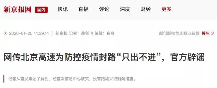 從今天(1月25日)中午開始,微信、微博等多個(gè)社交媒體平臺上陸續(xù)傳出“為了防控新型冠狀病毒肺炎疫情,北京高速進(jìn)京方向已封路”的消息。