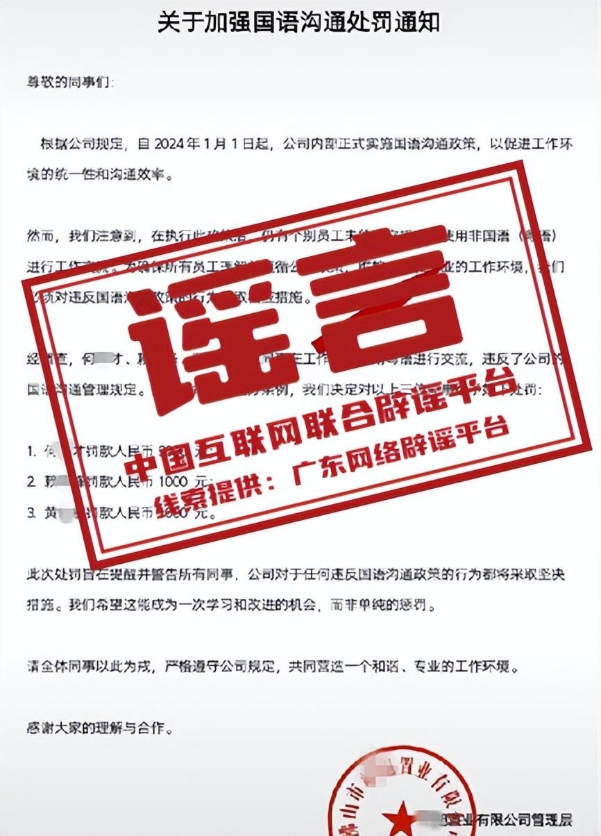真相:近日,網傳“廣東佛山一公司有員工因講粵語被罰款五千元”的消息引發熱議。經佛山警方核查,上述消息不實,系劉某杰(男,21歲,網傳涉事公司負責人)為吸引眼球、博取流量而編造并傳播。劉某杰的公司實際上只有其一人,沒有其他員工,不存在所謂員工因講粵語被罰款的情況。目前,犯罪嫌疑人劉某杰因在多個網絡平臺散播不實信息,造成惡劣社會影響,嚴重擾亂網絡公共秩序,已被公安機關依法刑事拘留。(來源:“廣東省互聯網舉報中心”微信公眾號)