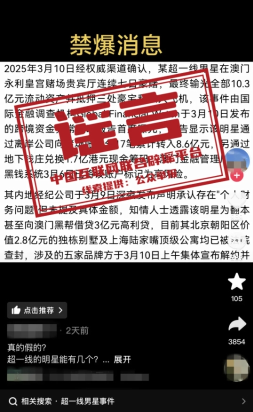 辟 謠 使用AI捏造“頂流明星在澳門輸了10億”謠言,擾亂公共秩序,依法行政拘留