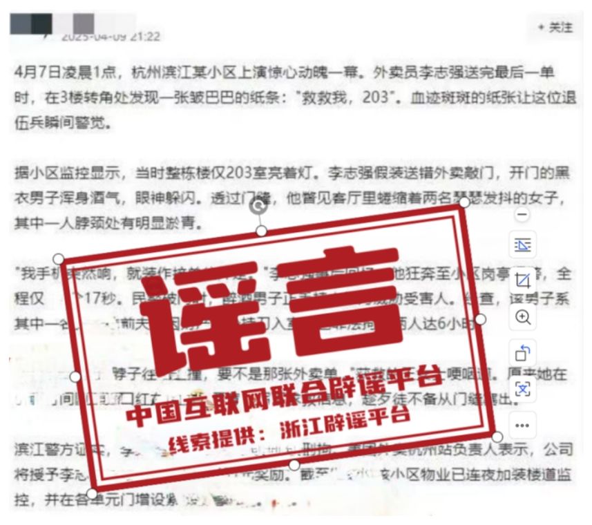 詳情:近日,一社交平臺賬號發布題為杭州“濱江區發生惡性刑事案,嫌疑人已被刑拘”的信息,引發網絡關注。4月15日,杭州濱江公安分局發布情況說明稱,經核查,文中所述“4月7日凌晨濱江區發生惡性案件”等內容純屬虛構。該賬號使用者謝某某(男,28歲,自由職業者)為博取流量關注,利用AI生成工具捏造虛假案情,經深度編輯后發布于社交平臺。濱江警方已依法對謝某某作出行政處罰,責令立即刪除全部不實信息,并處以500元罰款。(來源:浙江辟謠平臺)