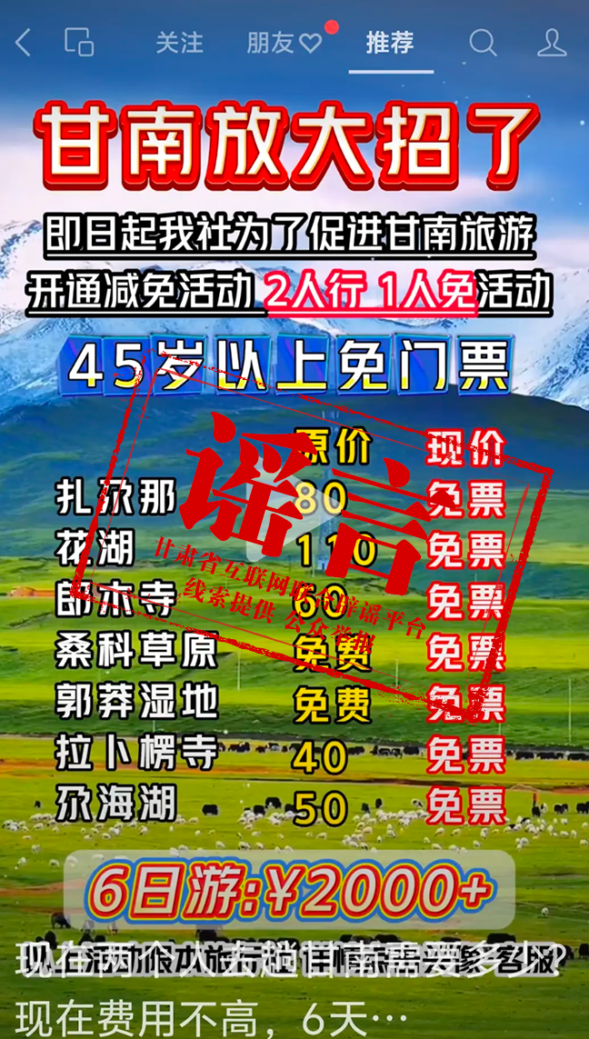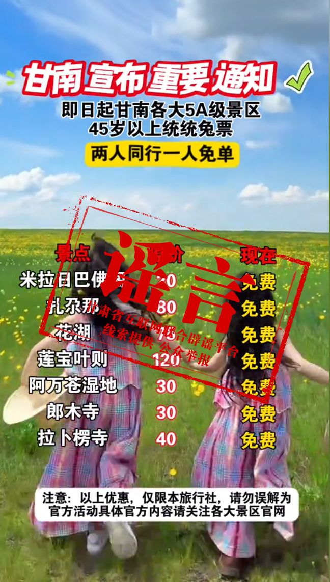 近日,個(gè)別旅行社營(yíng)銷(xiāo)賬號(hào)在微信視頻號(hào)、抖音等部分網(wǎng)絡(luò)平臺(tái)上發(fā)布“甘南各大景區(qū)45歲以上游客免票”“甘南旅游局推出45歲以上景區(qū)免票政策”等不實(shí)信息,此類(lèi)信息系虛假宣傳,切勿相信。