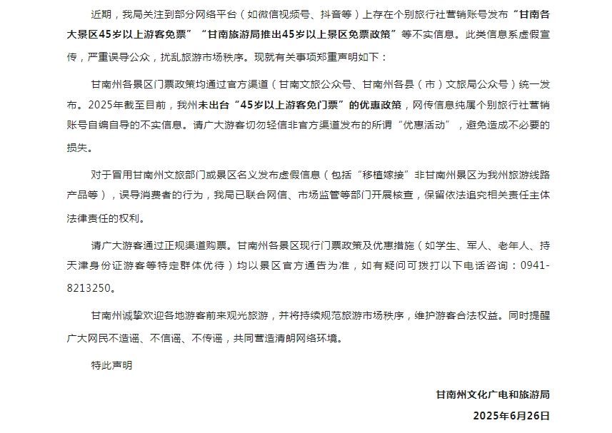 6月26日,甘南州文化廣電和旅游局發(fā)布聲明稱(chēng),2025年至目前,甘南州未出臺(tái)“45歲以上游客免門(mén)票”的優(yōu)惠政策,網(wǎng)傳信息屬個(gè)別旅行社營(yíng)銷(xiāo)賬號(hào)自編自導(dǎo)的不實(shí)信息。請(qǐng)廣大游客切勿輕信非官方渠道發(fā)布的所謂“優(yōu)惠活動(dòng)”,避免造成不必要的損失。